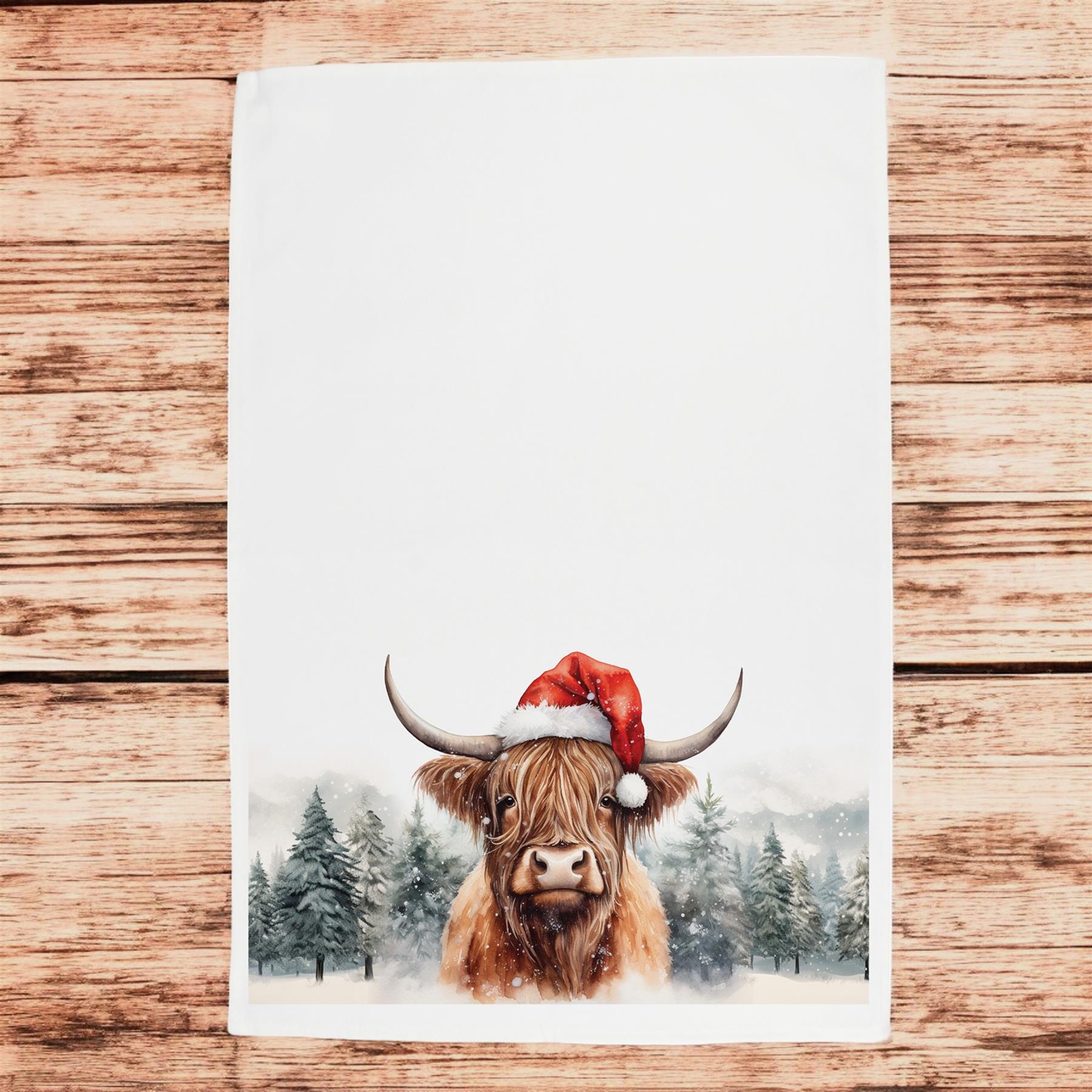 A lovely Christmas gift for animal lovers, this kitchen tea towel features an adorable highland cow stood in a snowy field, wearing a festive Santa hat! This delightful linen is ideal for drying dishes, cleaning spills, or just for display.