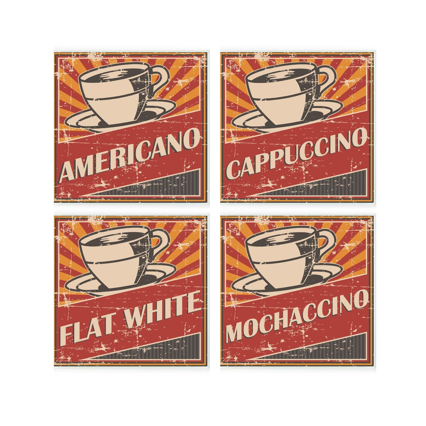 Featuring vintage 1950's diner-inspired prints, this set of glass coasters are ideal for bringing a bygone era to your home décor! Covered in retro coffee-themed designs.