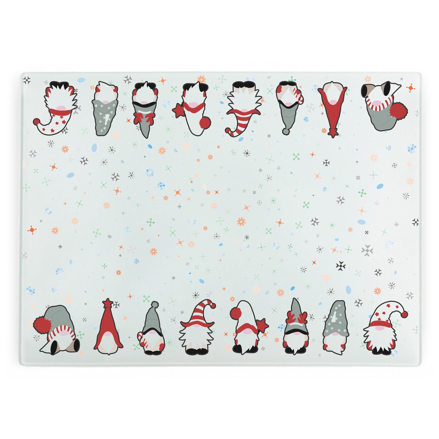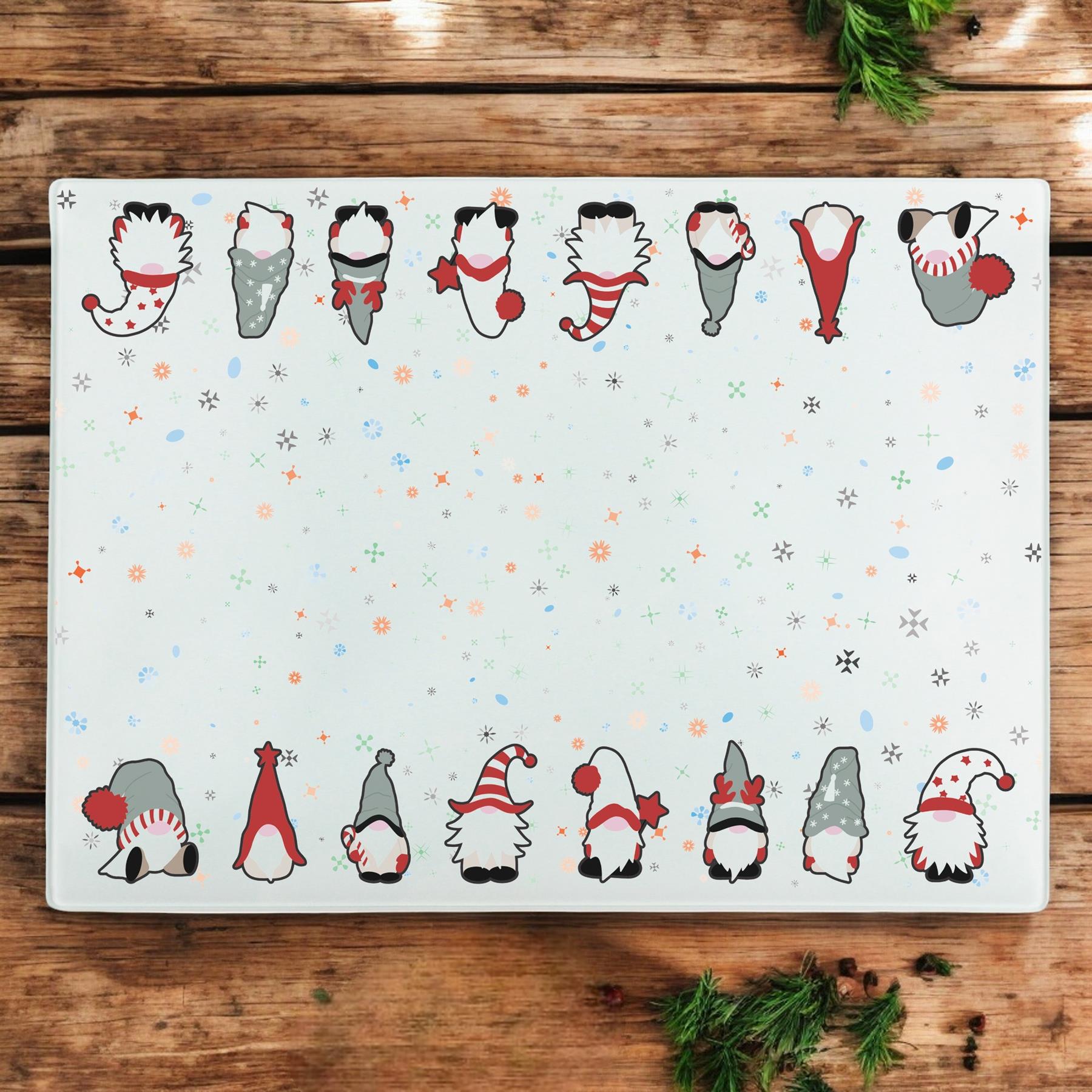 This festive large rectangular glass worktop protector features a row of adorable gonks, kitted out ready for Christmas! Wrapped up warm in their cosy hats, amongst falling snowflakes. A perfect gift for friends and family who love the Xmas season!