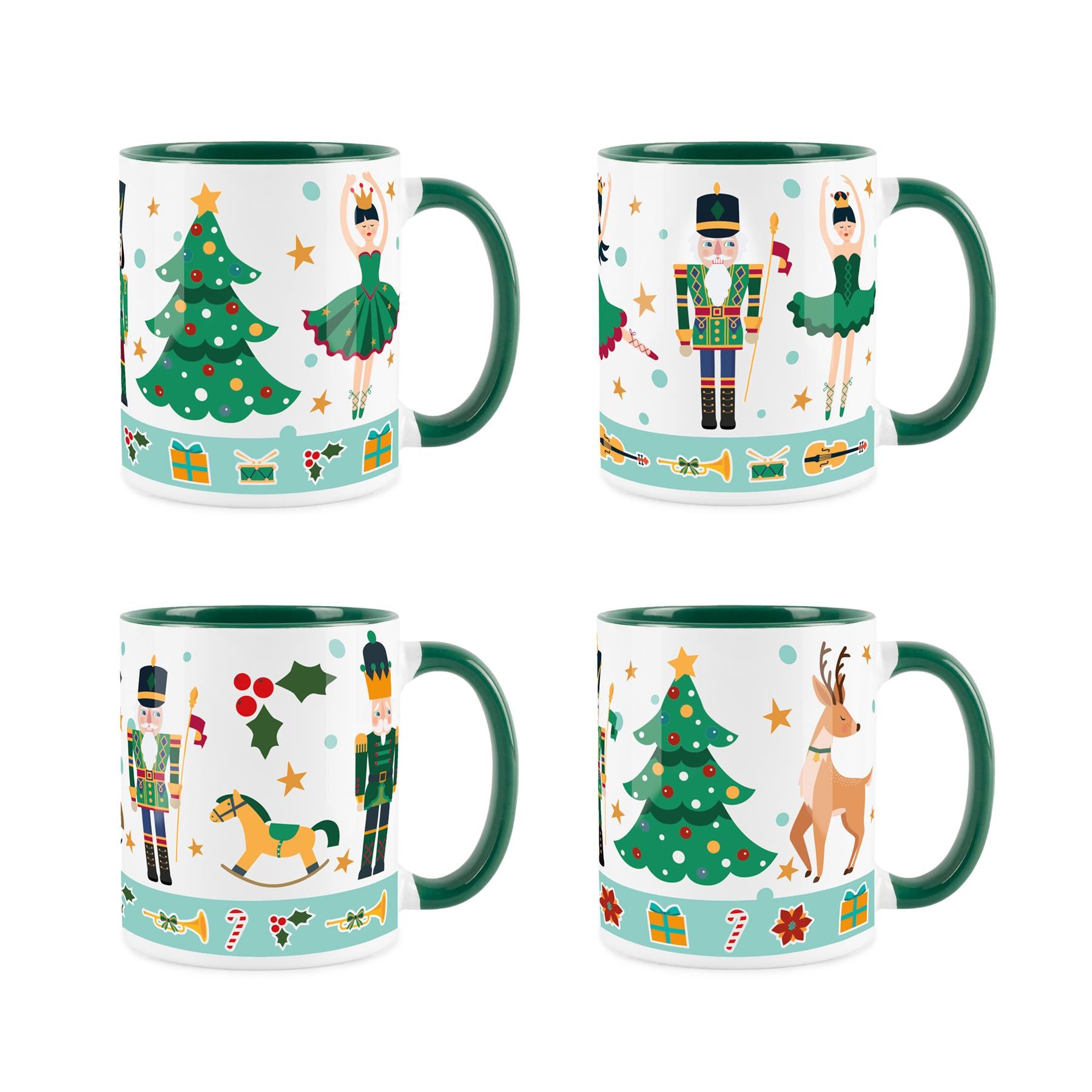 The bright colours of the nutcrackers and all his festive friends enhance holiday cheer, while the dark green interior brings that extra warm comfort to your yummy festive drink. Sold in a set of 4, everyone in the family can have their very own, unique printed Christmas mug!