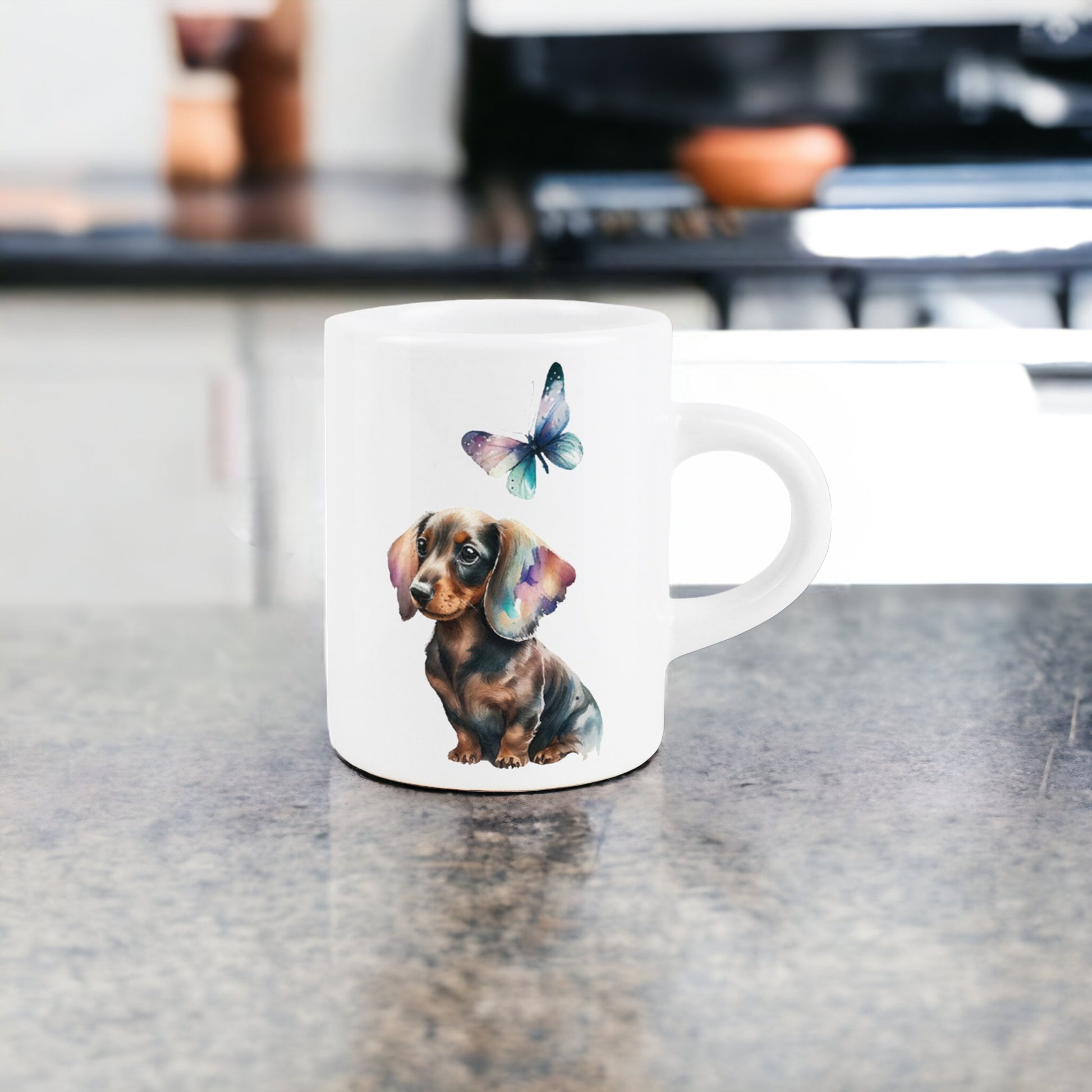 This small ceramic espresso mug features an adorable dachshund and butterfly design, perfect for a morning coffee to start your day! The durable mug has a 75ml capacity, is ideal for a yummy espresso, cortado, affogato or babyccino, and is dishwasher safe for extra convenience.