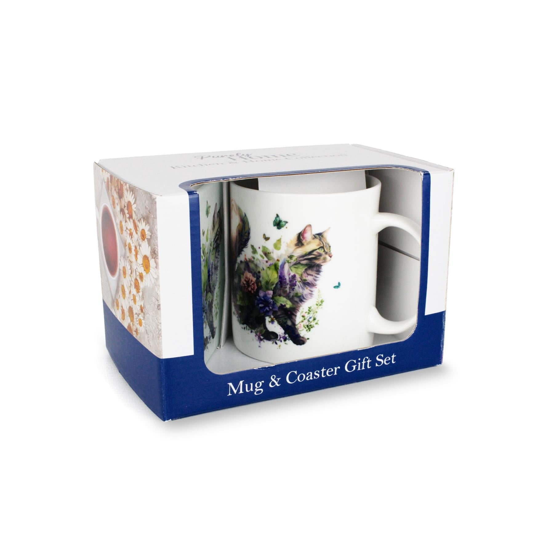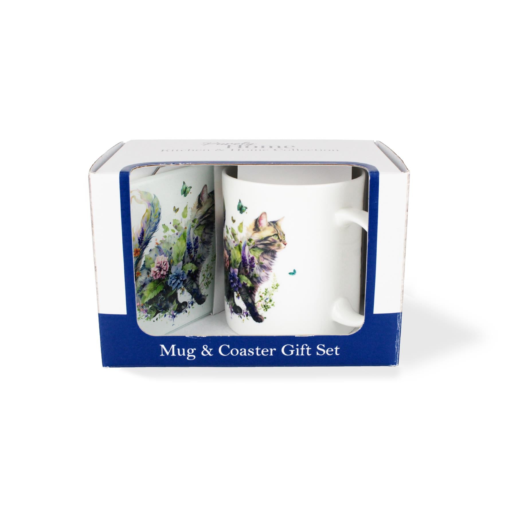 This set is just the thing for cat lovers in your life! Featuring a sweet cat design, made up of pretty flowers and butterflies, this set consists of a bone china mug and a square glass coaster to protect your surfaces.
