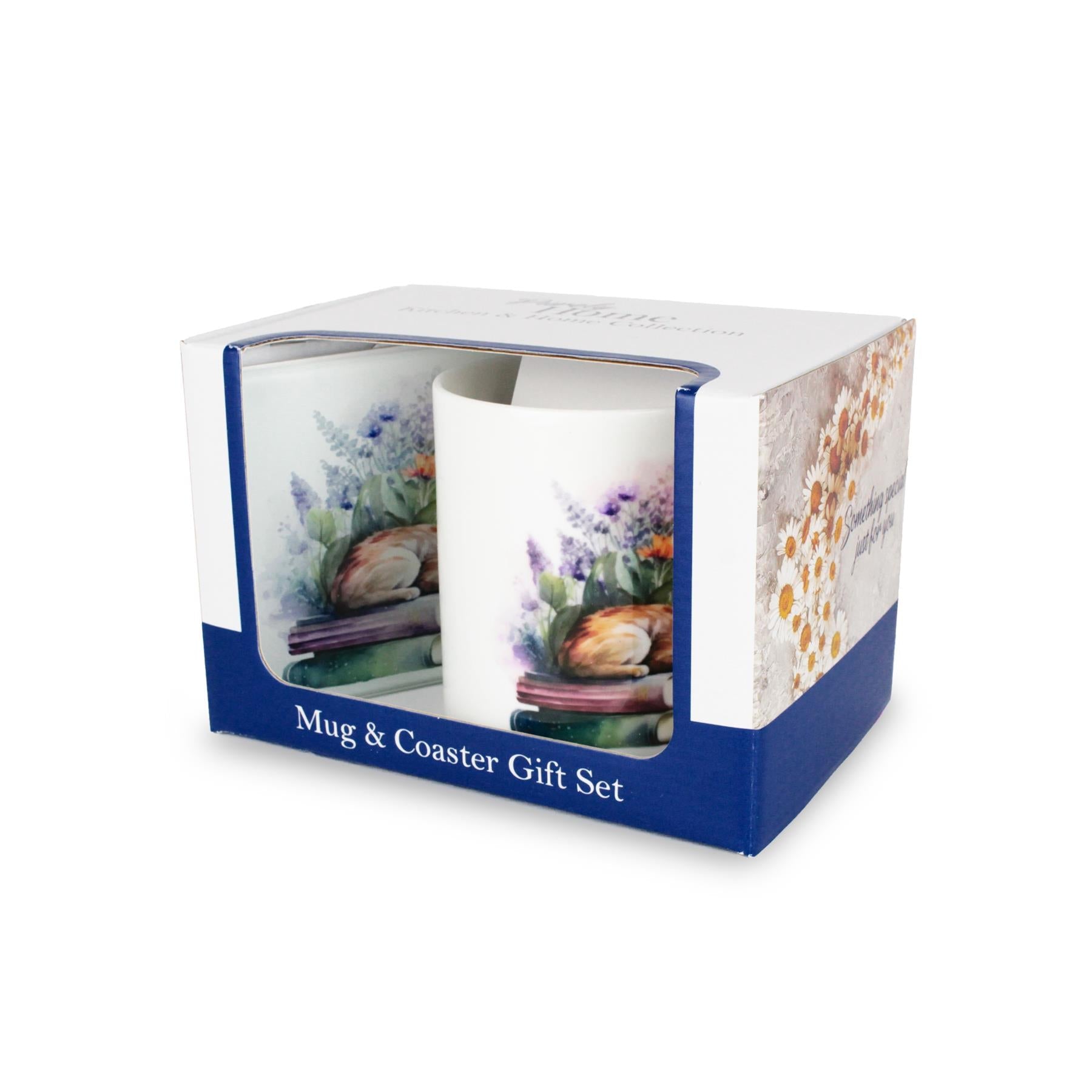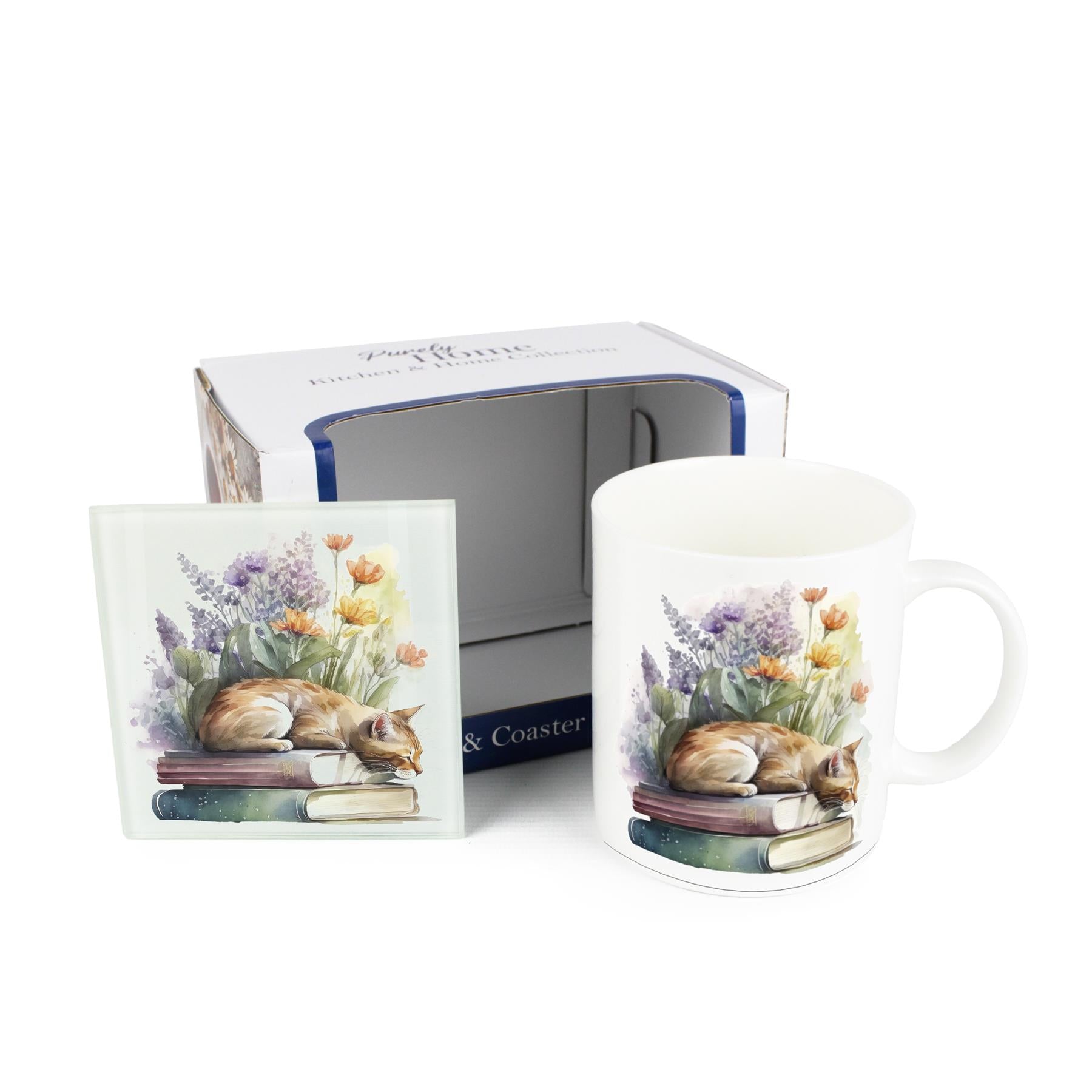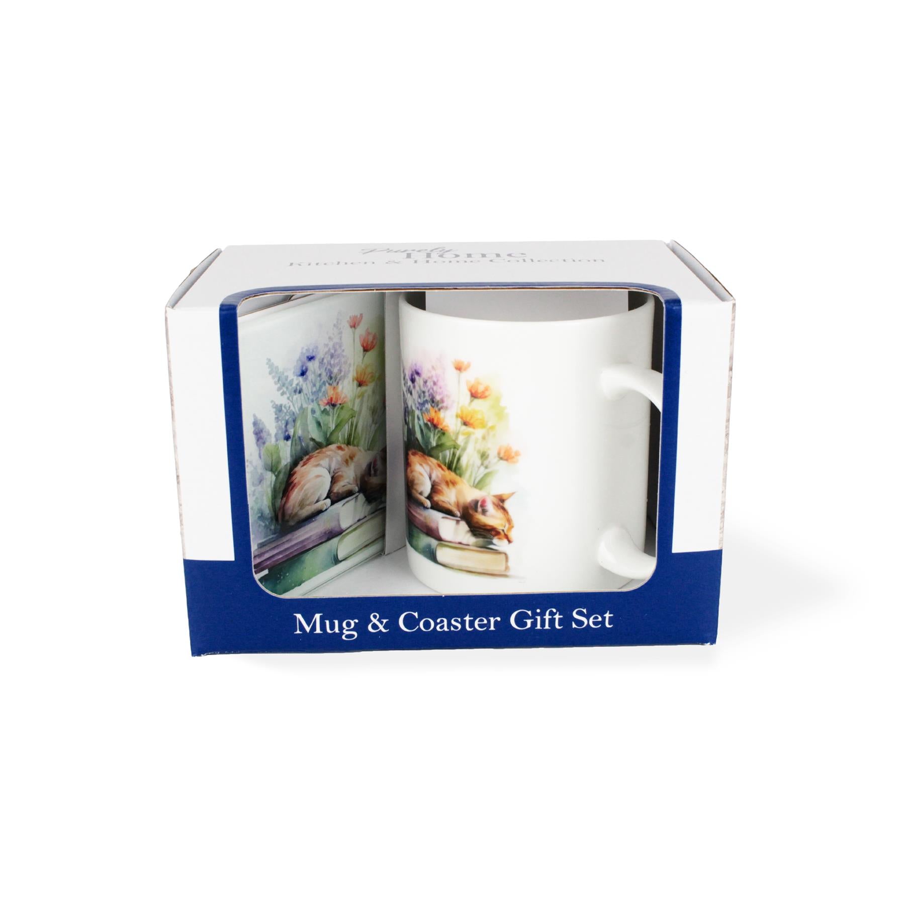 This set is just the thing for cat lovers in your life! Featuring a sweet cat design, made up of pretty flowers and butterflies, this set consists of a bone china mug and a square glass coaster to protect your surfaces.