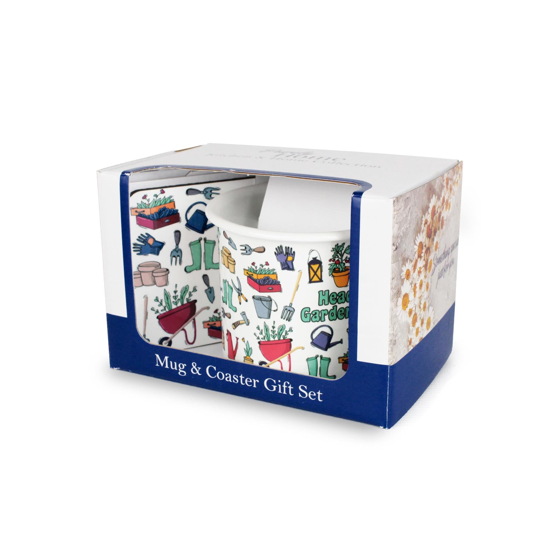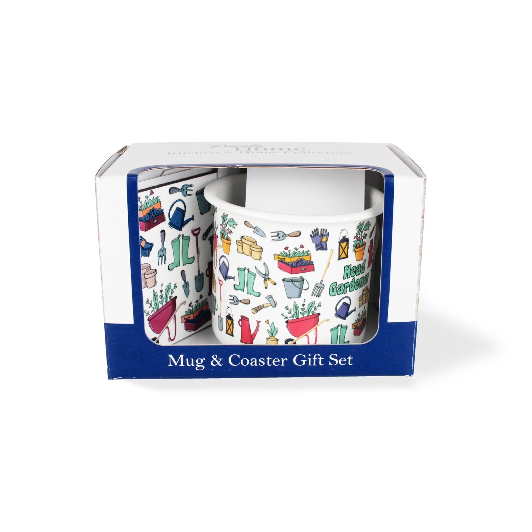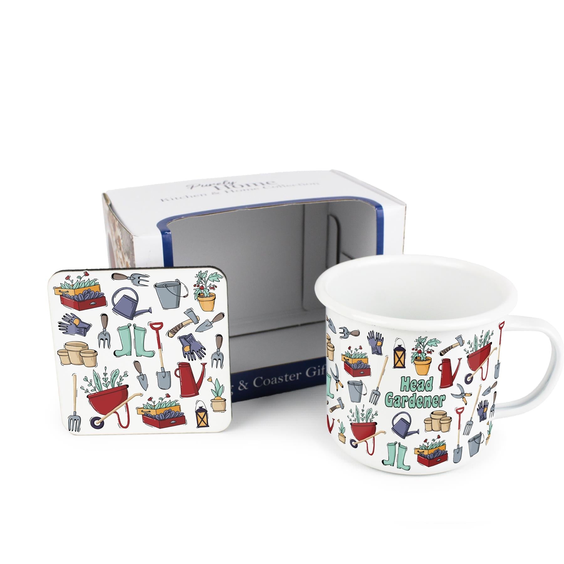 Surprise the gardening enthusiast in your life with this fun mug & coaster set! With a colourful gardening inspired print, and text labelling the recipient the 'Head Gardener'. This set consists of an enamel mug and a square cork coaster to protect your surfaces.