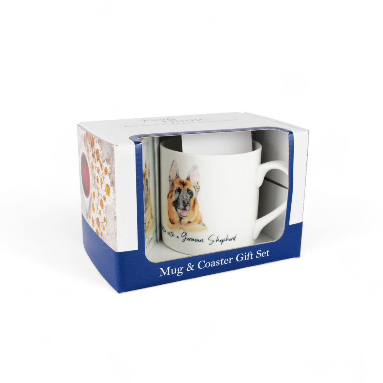 This adorable bone china mug & coaster gift set features a sweet hand drawn German Shepherd, with the slogan "Life's better with a German Shepherd". Perfect as a gift for dog lovers, this set consists of a bone china mug and a square glass coaster to protect your surfaces.