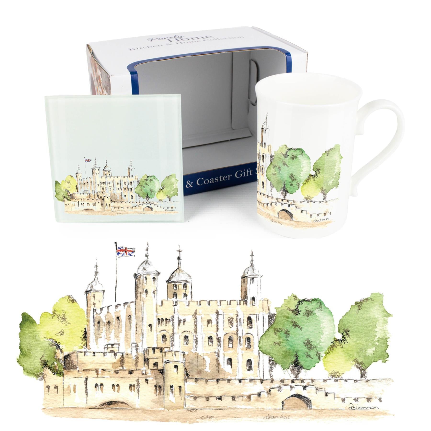 Bring the sights of the UK to your kitchen with this beautifully designed British landmark mug & coaster set! Featuring a watercolour painting of the Tower of London by artist Rhiannon Chauncey, this set is perfect as a gift for yourself or for others!