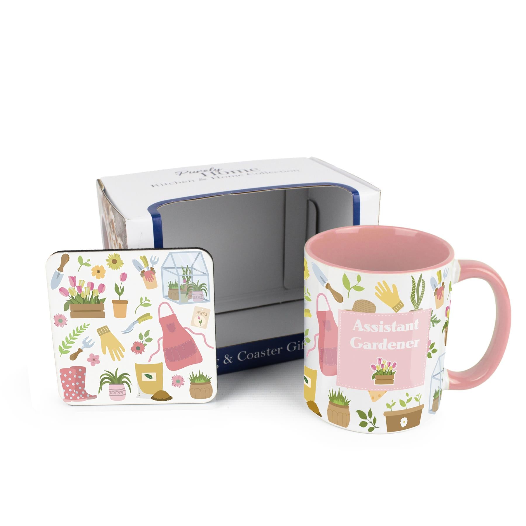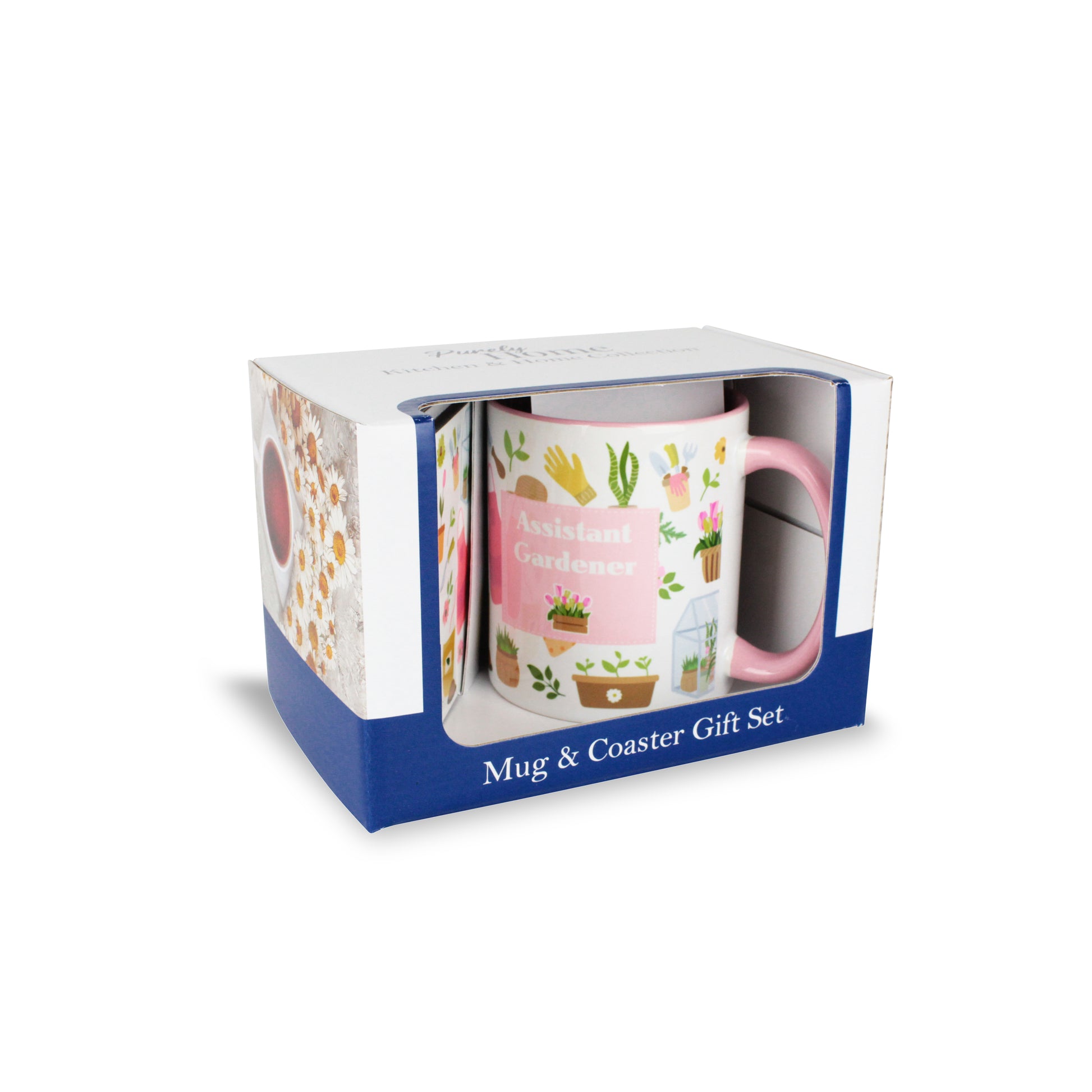 Surprise the gardening enthusiast in your life with this pretty mug & coaster set! With a pink garden inspired print, and text labelling the recipient an 'Assistant Gardener'. This set consists of a ceramic mug and a square cork coaster to protect your surfaces.