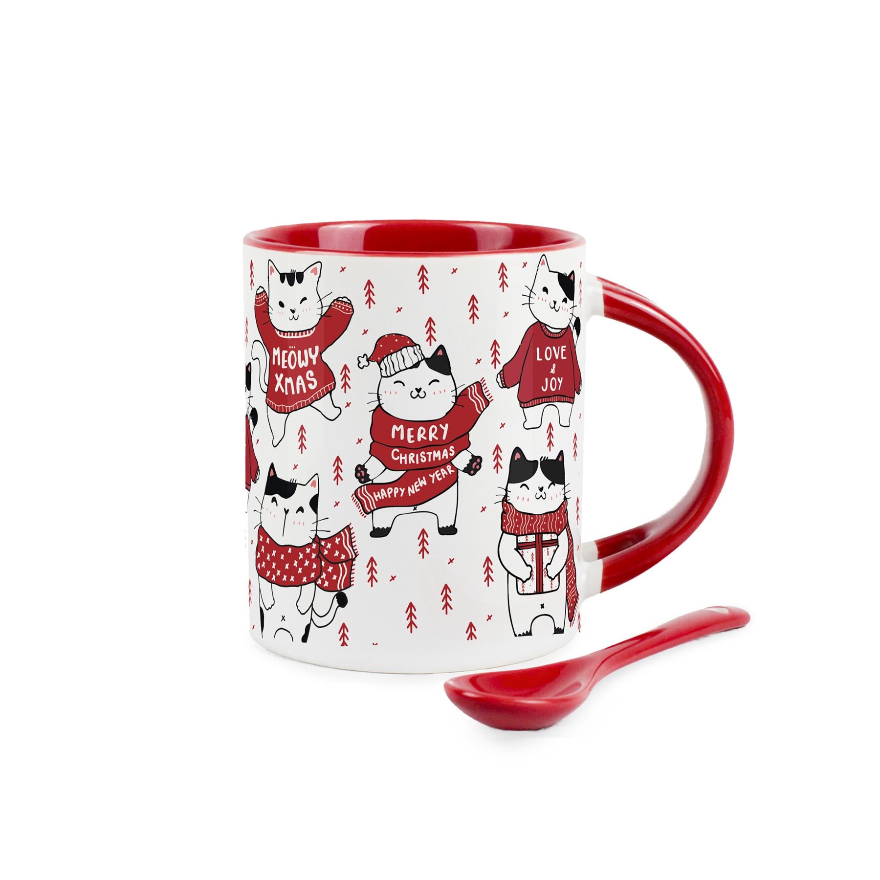 This adorable, cat themed ceramic mug & spoon set features festive kittens dressed up in cosy scarves and jumpers - decorated with Christmas trees and presents. Perfect for a deliciously rich hot chocolate, or as a gift for cat-loving friends and family!