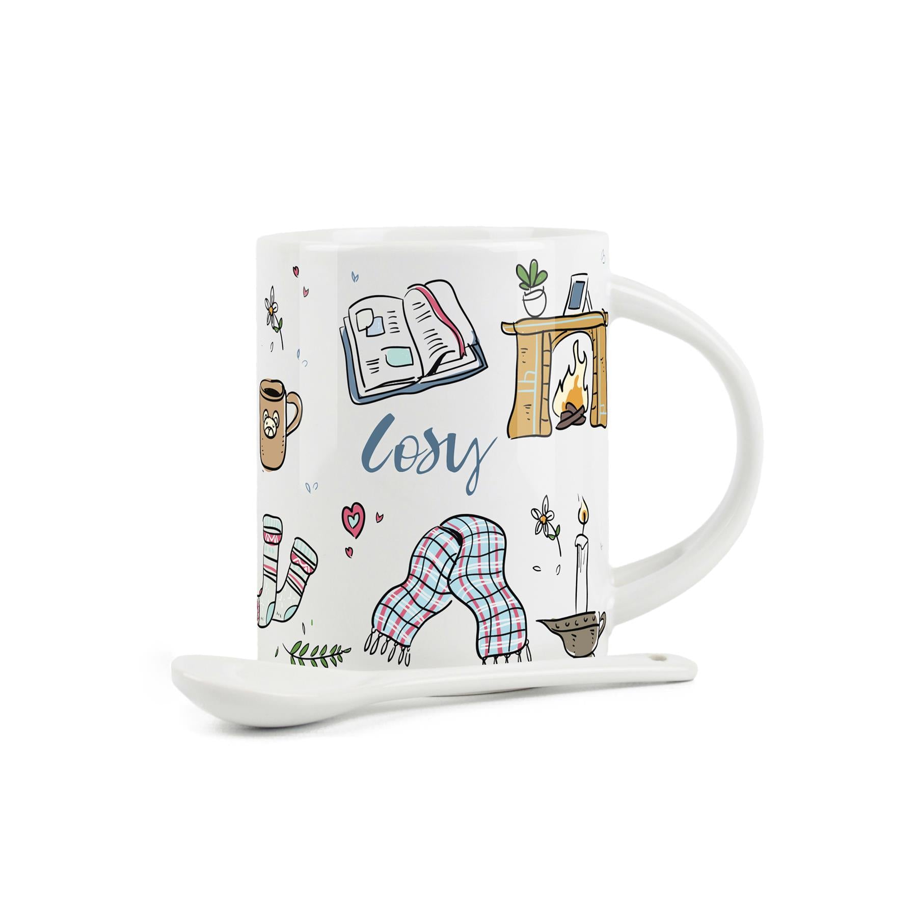 This lovely ceramic mug & spoon set features a cosy winter-themed design, with candles, books and scarves. Perfect for a deliciously rich hot chocolate, soup or cup of tea in the colder months! With a 325ml capacity, this mug would make a perfect gift for friends, family and loved ones. The mug is dishwasher-safe for extra convenience.