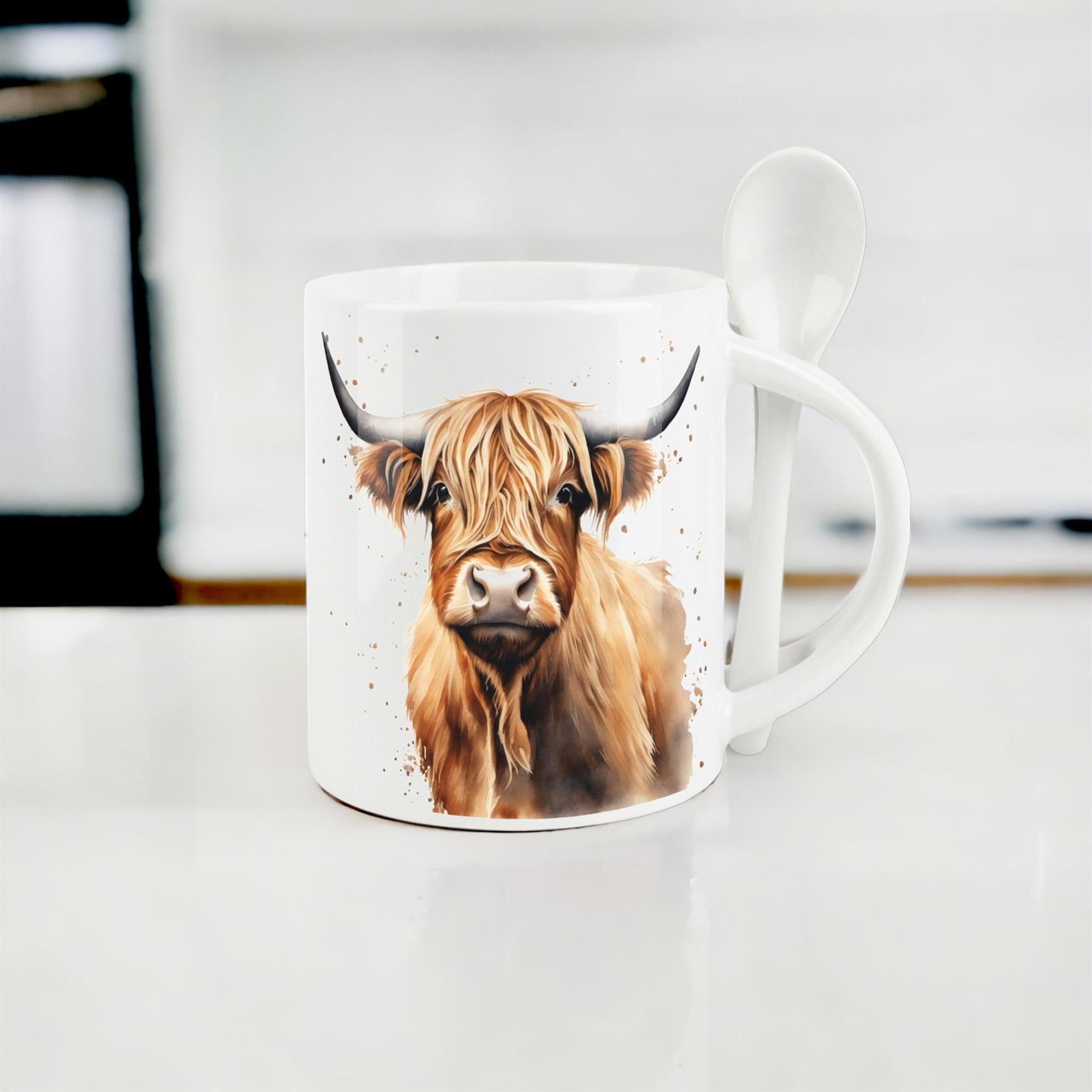 This lovely ceramic mug & spoon set features an udderly adorable highland cow design! Perfect for a deliciously rich hot chocolate, soup or cup of tea! With a 325ml capacity, this mug would make a perfect gift for friends, family and loved ones. The mug is dishwasher-safe for extra convenience.