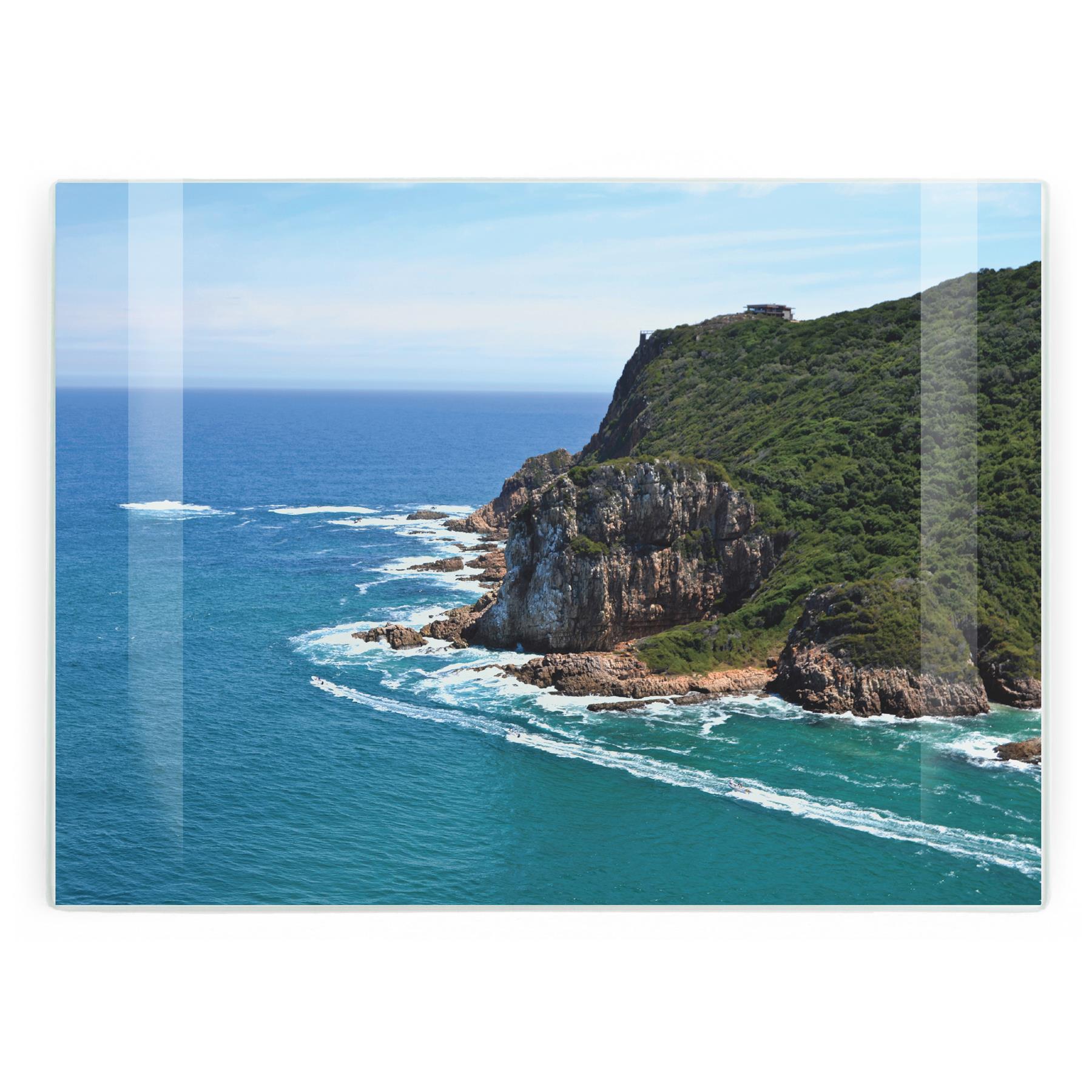 This large glass worktop protector features a stunning landscape scene of the ocean, with luscious green cliffs overlooking. Ideal for reminiscing about beautiful summer trips to the coast!